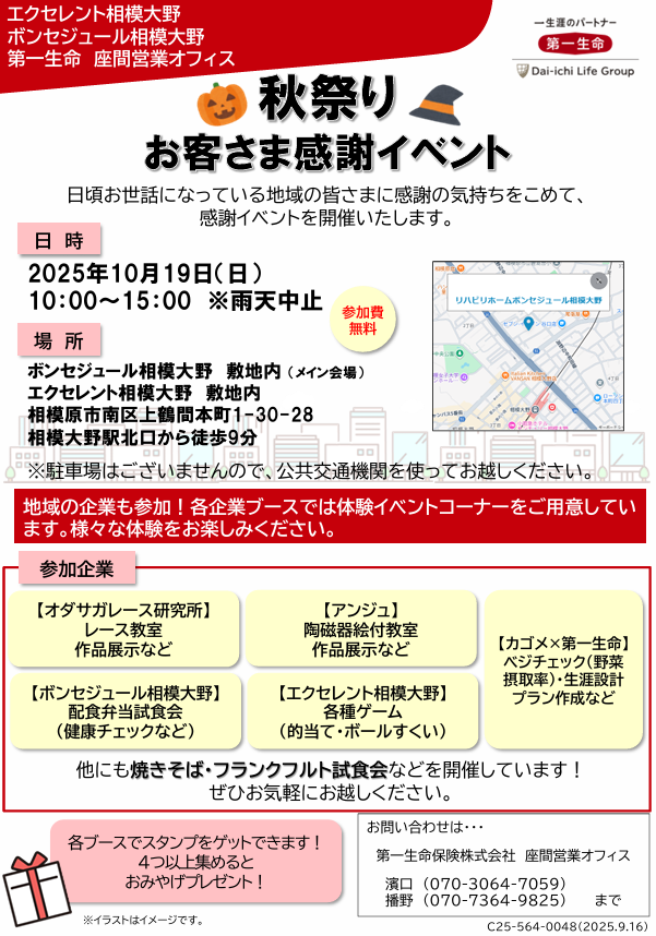 上鶴間本町にあるグループホーム「えくせれんと相模大野」で2025年10月19日(日)「秋祭り お客様感謝イベント」が開催されます。(雨天の場合は中止)リハビリホームボンセジュール相模大野、第一生命 座間営業オフィスとの共同開催となります。