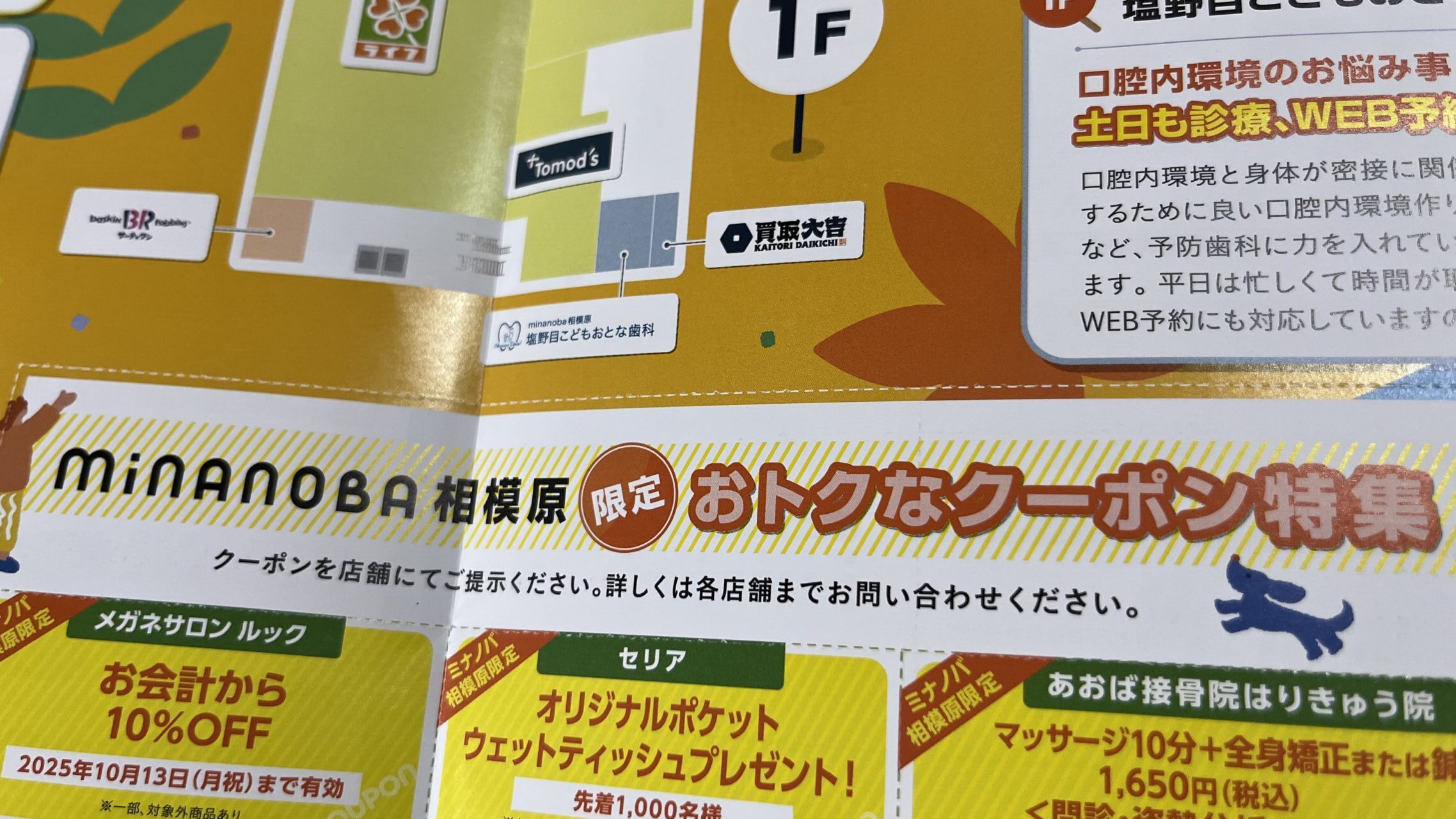 2Fフロアには変化があり、9月29日に楽天モバイルがオープン。さらに11月初旬には「むかえ内科・内視鏡クリニック」がオープン予定と、新しい動きがあるようです。キャンペーンチラシには各店舗の楽しみ方や、お得なクーポンも付いていました。
