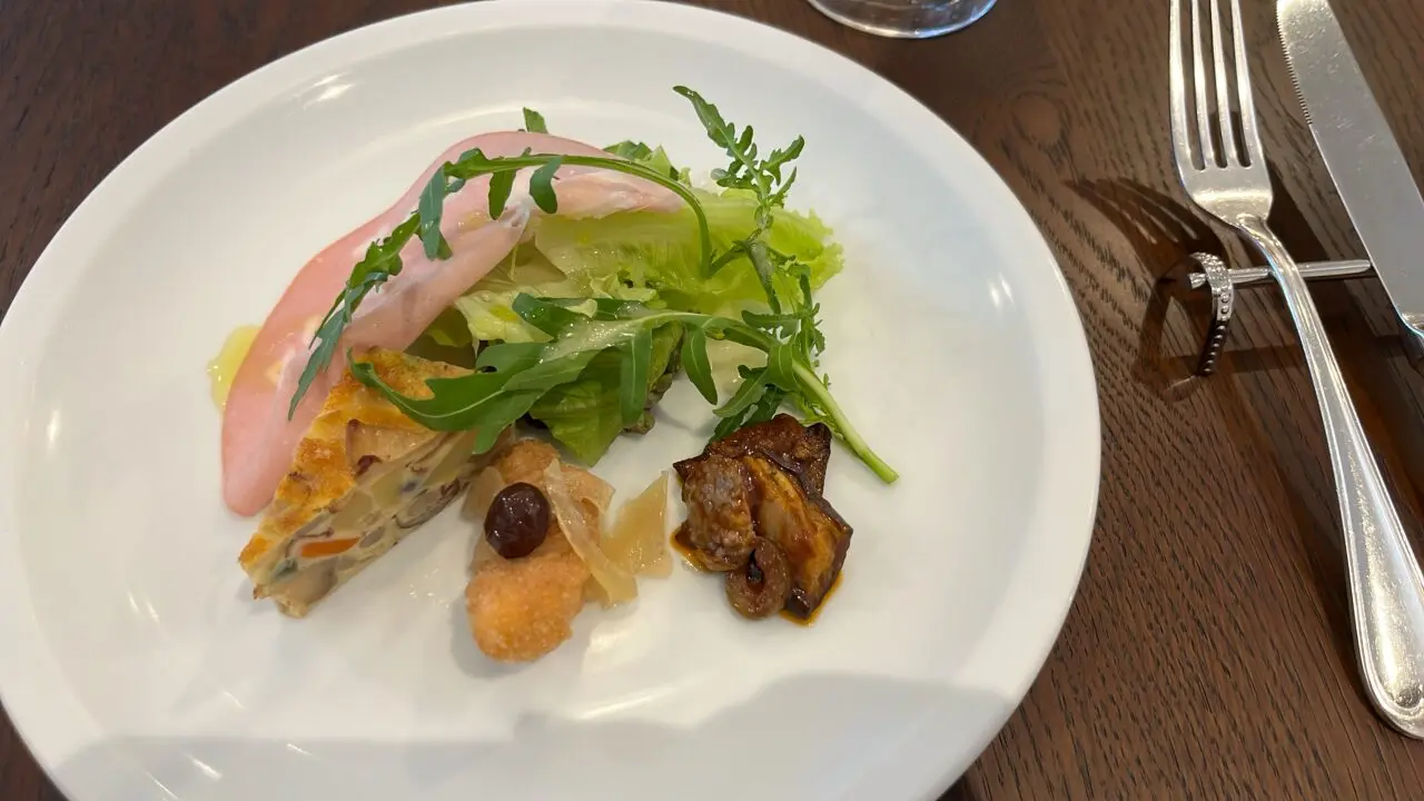 ある日のランチ。前菜は茄子のカポナータ、若鶏の南蛮漬け、季節野菜のオムレツ、モルタデッラ(ソーセージ)が並んでいました。色々な食材を少しずつ楽しめる贅沢ランチ!