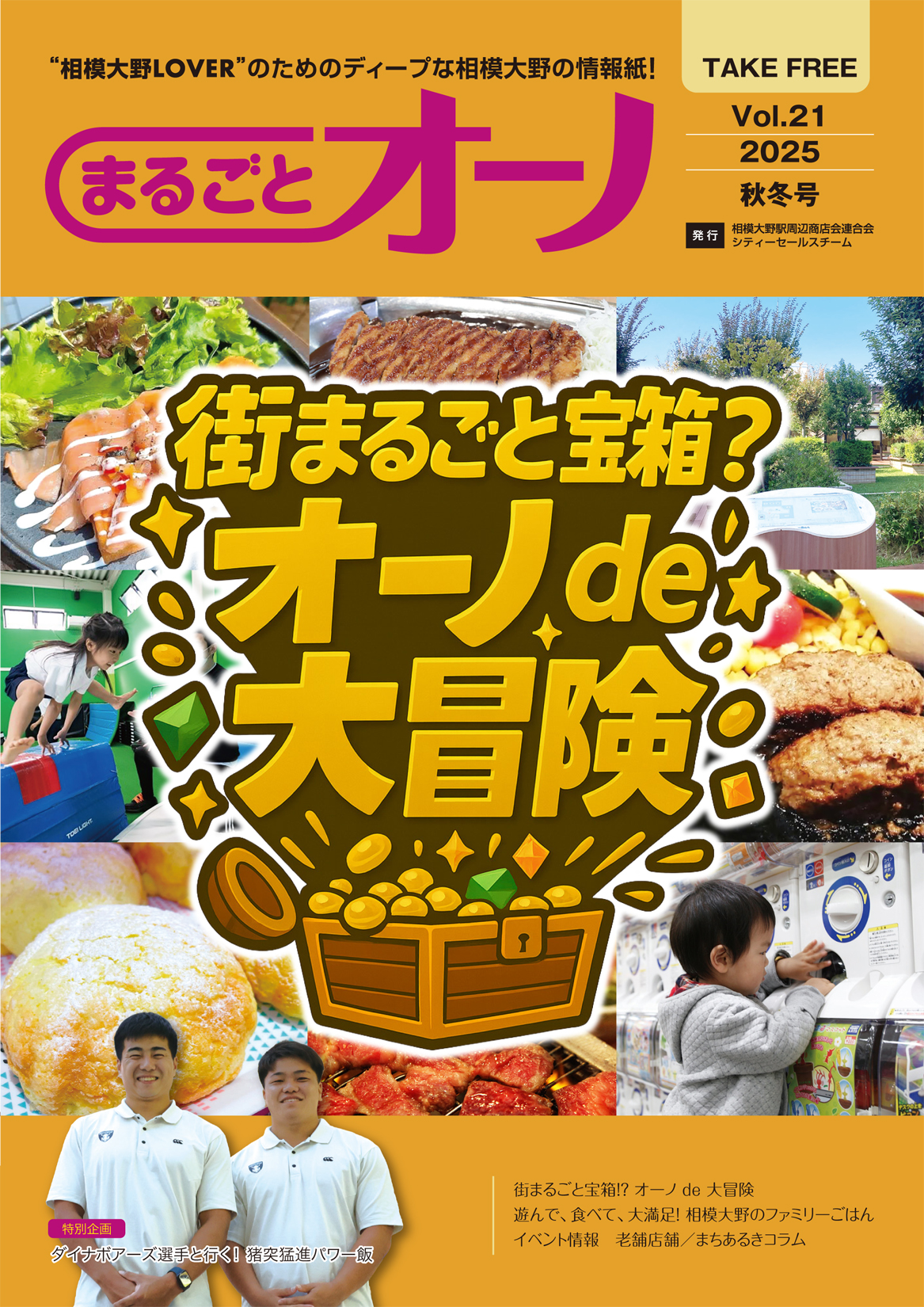 新号となる「まるごとオーノvol.21」では、ボーノ相模大野に新設された「キッズランドUS mini」など体を動かせるスポットで、子どもも大人も「大冒険」をしながら自分なりの「宝探し」をテーマに特集。2025年12月からのリーグ開催を控えたラグビーチーム「三菱重工相模原ダイナボアーズ」の選手らと共に飲食店を巡る企画も掲載しています。今年で10年を迎えた「まるごとオーノ」は2015年11月、相模大野の4つの商店街が集い、相模大野の地域振興のために創刊しました。各店舗、施設でラック設置を行うなど、街のあちこちで手に取ることができます。おすすめの飲食メニュー、季節のお役立ちグッズ、イベント情報など、情報盛りだくさん。ボーノ相模大野、ロビーファイブなどの商業施設にも設置されています。気になる方は相模大野でGETされてはいかがでしょうか?