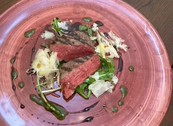葉山クイーンビーフのタリアータハーブとバルサミコの2種類のソース。葉山クイーンビーフは神奈川県で生産されるブランド和牛「葉山牛」の一種です。独自の飼料で育てられた、希少で高品質な牛肉で、濃厚な肉の甘みが特徴です。