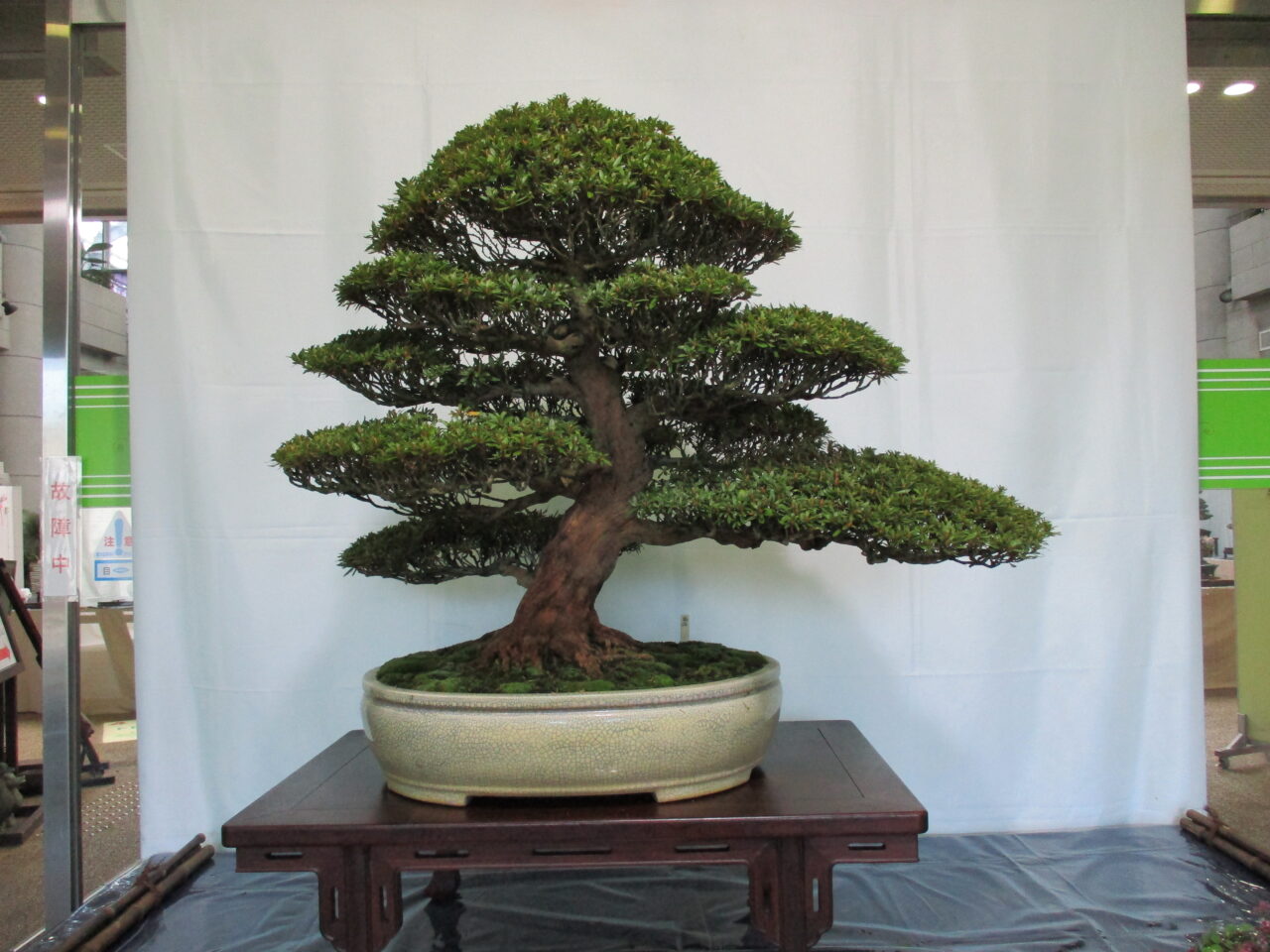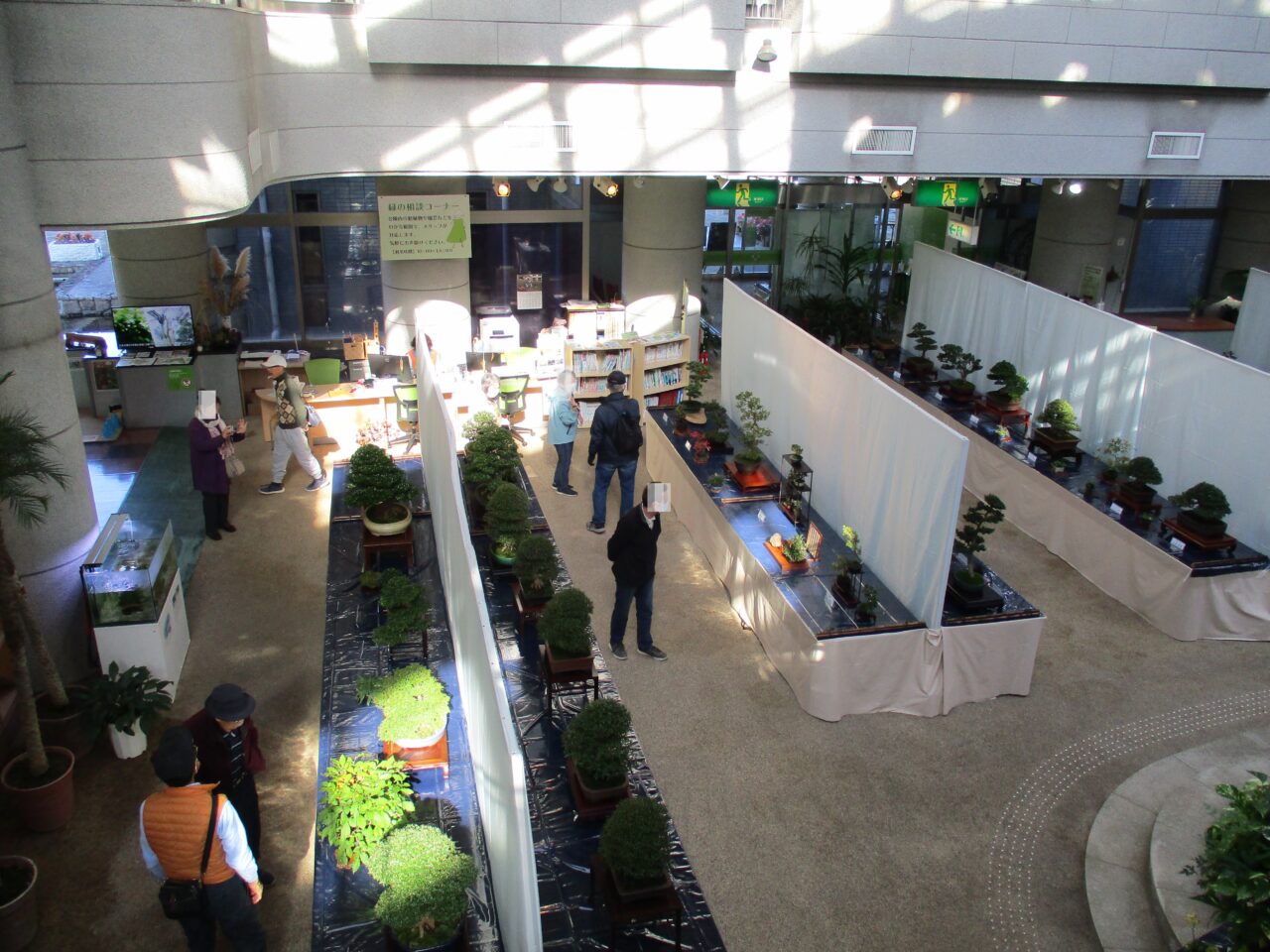 会場はサカタのタネグリーンハウス内で、入場は無料です。愛好家の方々が丹精込めて育てられたさつき盆栽をお楽しみください。