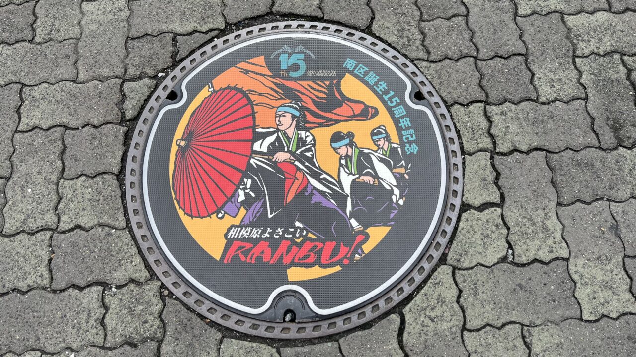 【相模原市南区】古淵駅前に「相模原よさこいRANBU!」マンホールが設置されています