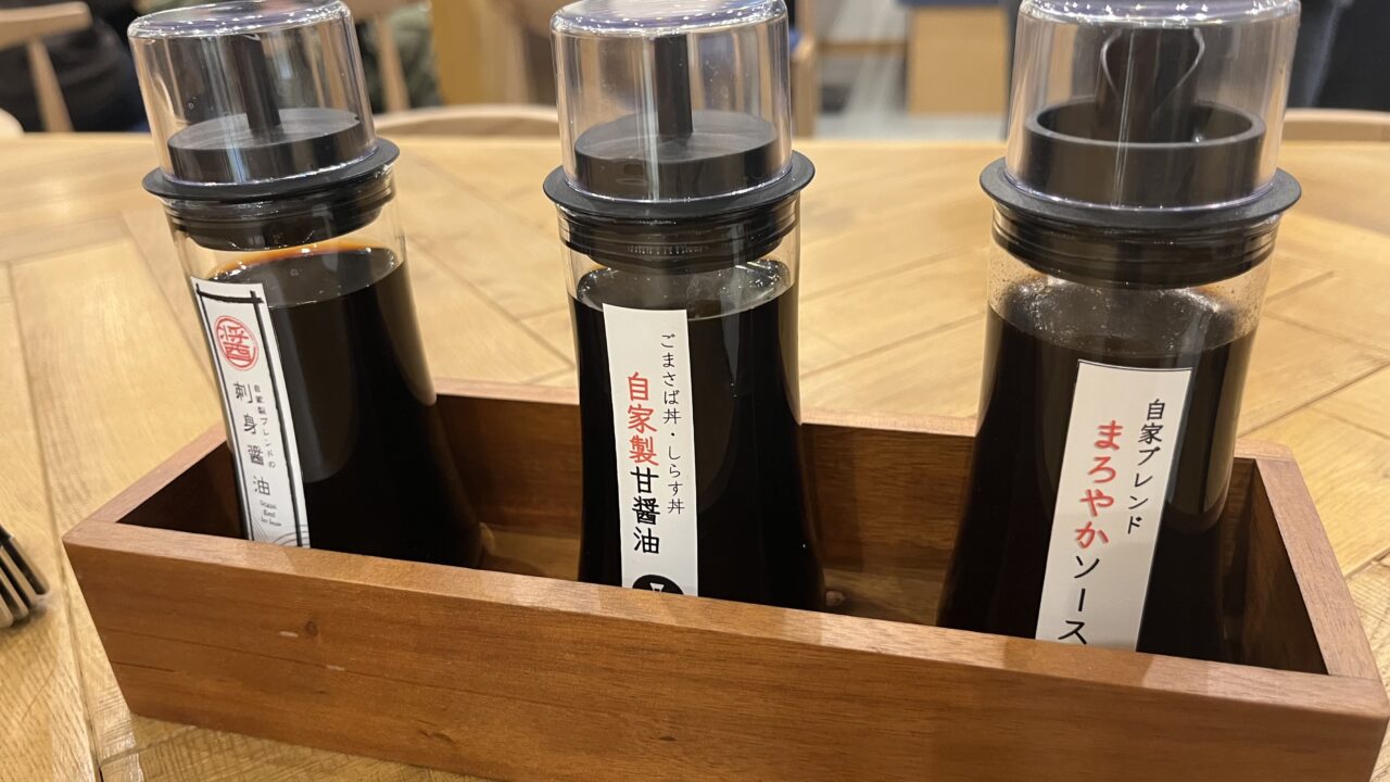 各テーブルにはお店オリジナルの刺身醤油、甘醤油、ソースが置いてありました。手間を惜しまず、調味料までも全て手づくりされているそうです。