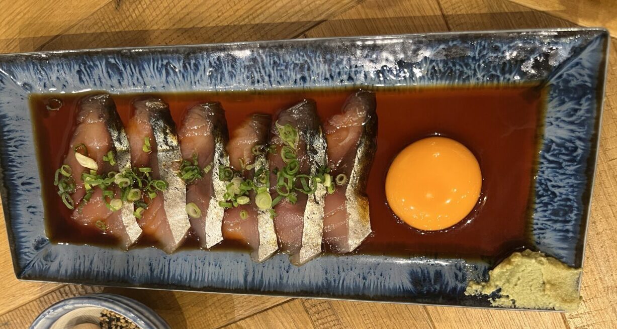 「ごまさば」は、甘辛い自家製たれと卵黄をからめていただく一品。小鉢に入った白黒のごまをすると、ふわっと香りが立ち上がり、鯖の切り身にかけて食べると絶品です。