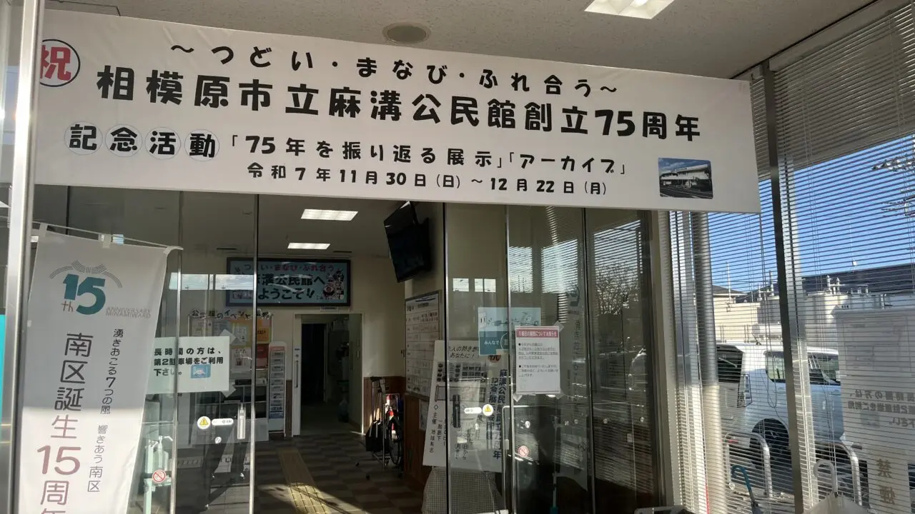 下溝にある麻溝公民館が創立75周年を迎えたことを記念し「75年を振り返る展示」「アーカイブ」を開催中です。麻溝公民館はJR相模線 原当麻駅から徒歩約5分の場所にあります。