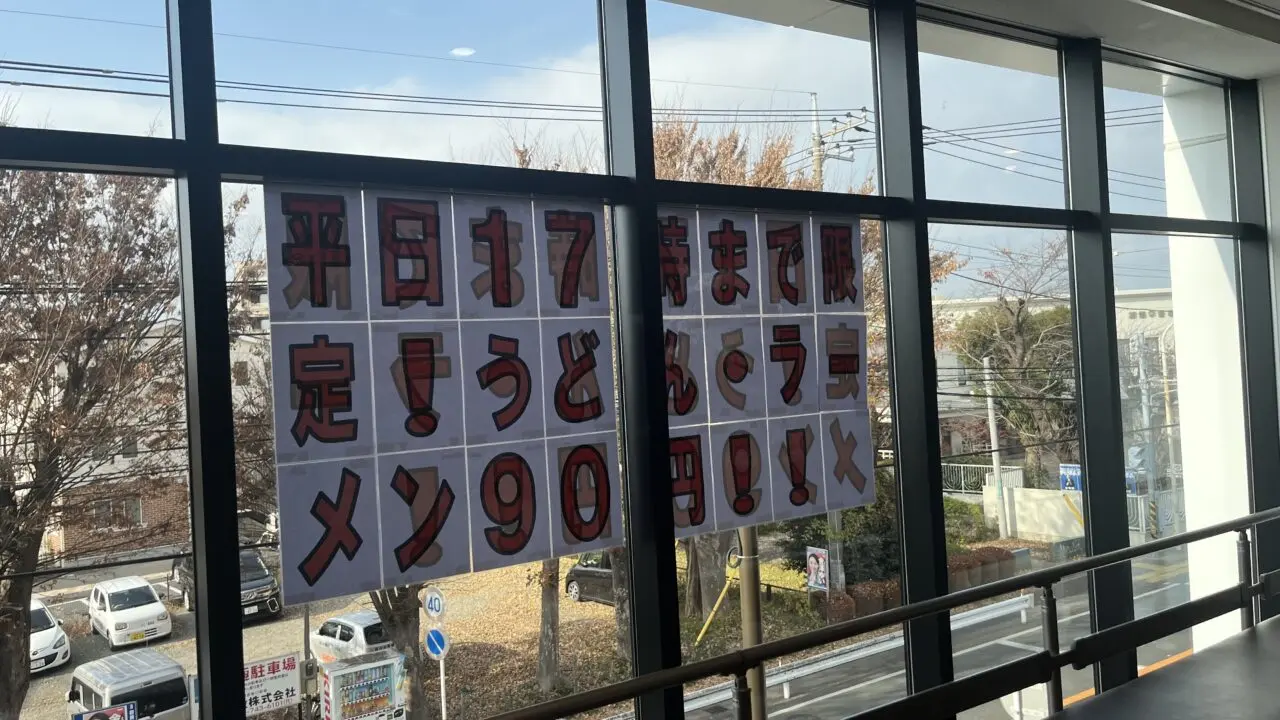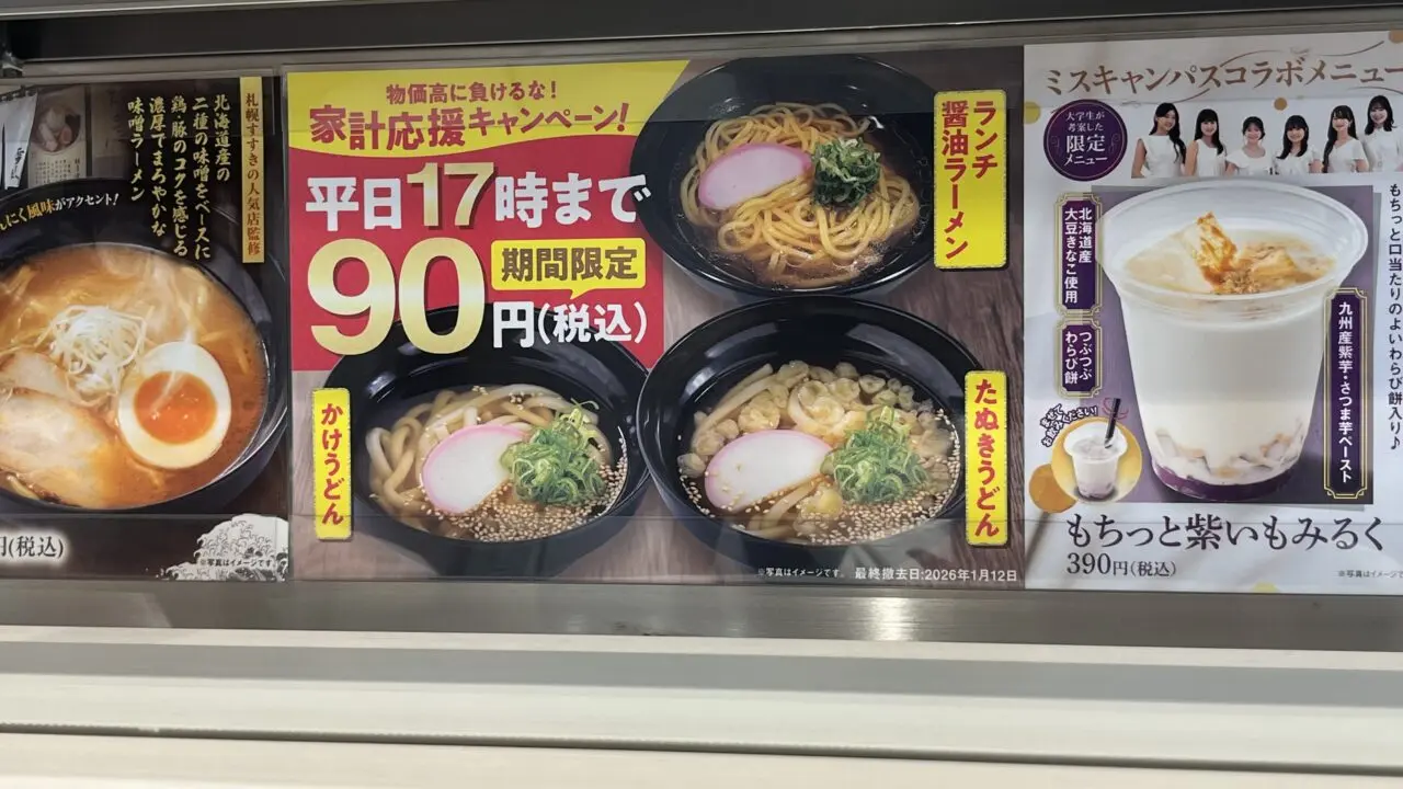 小田急線「小田急相模原」駅より徒歩9分ほどの場所にある「minanoba」2Fフロアの寿司チェーン店「魚べい」では家計応援キャンペーンと題して、2025年11月4日から平日ランチ限定でラーメンとうどんを90円(税込)で食べられるサービスを実施中です。実施期限は未定のようですが、撮影した12月2日時点ではまだ提供していました。