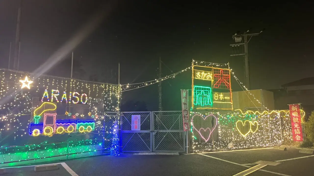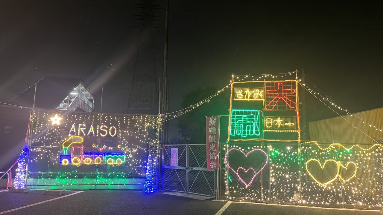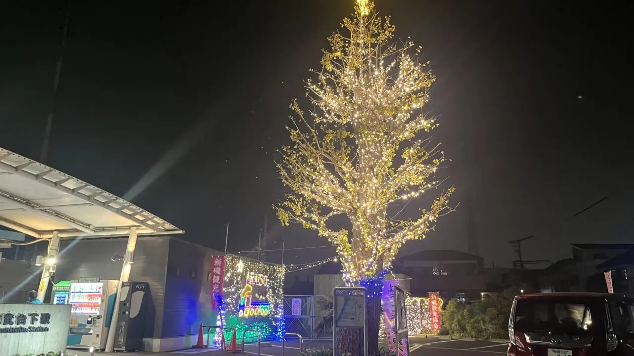 新磯観光協会のFacebookによると、11月29日に点灯式が行われたようです。大凧、汽車、ハートをかたどったイルミネーションの他、駅前の銀杏の樹にも一面、イルミネーションの装飾が! こちらは、高所の作業車の手配や、職人さんへの手当て等、費用がかかることもあり、いつまで見られるか分からないそうです。来年は見られるのでしょうか…。