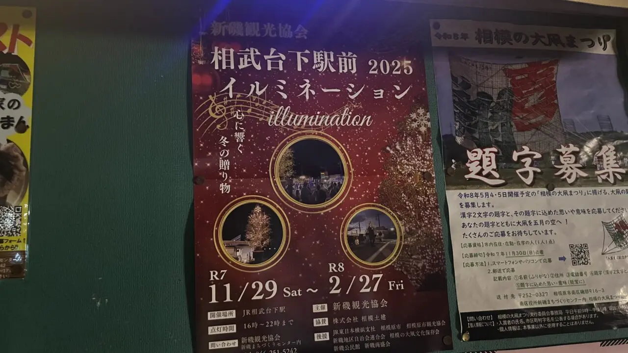 今年も相模線・相武台下駅前のイルミネーション点灯が始まりました。期間は2025年11月29日~2026年2月27日まで、毎日午後4時~10時の間、点灯します。