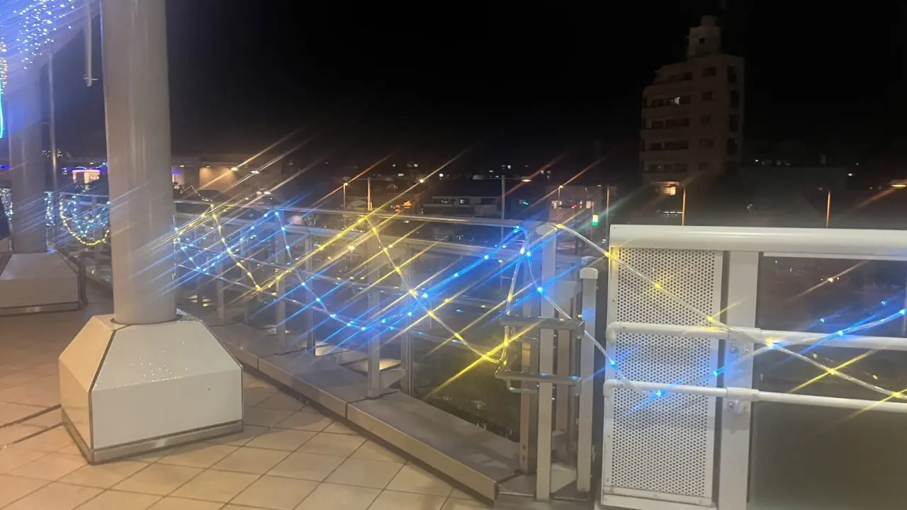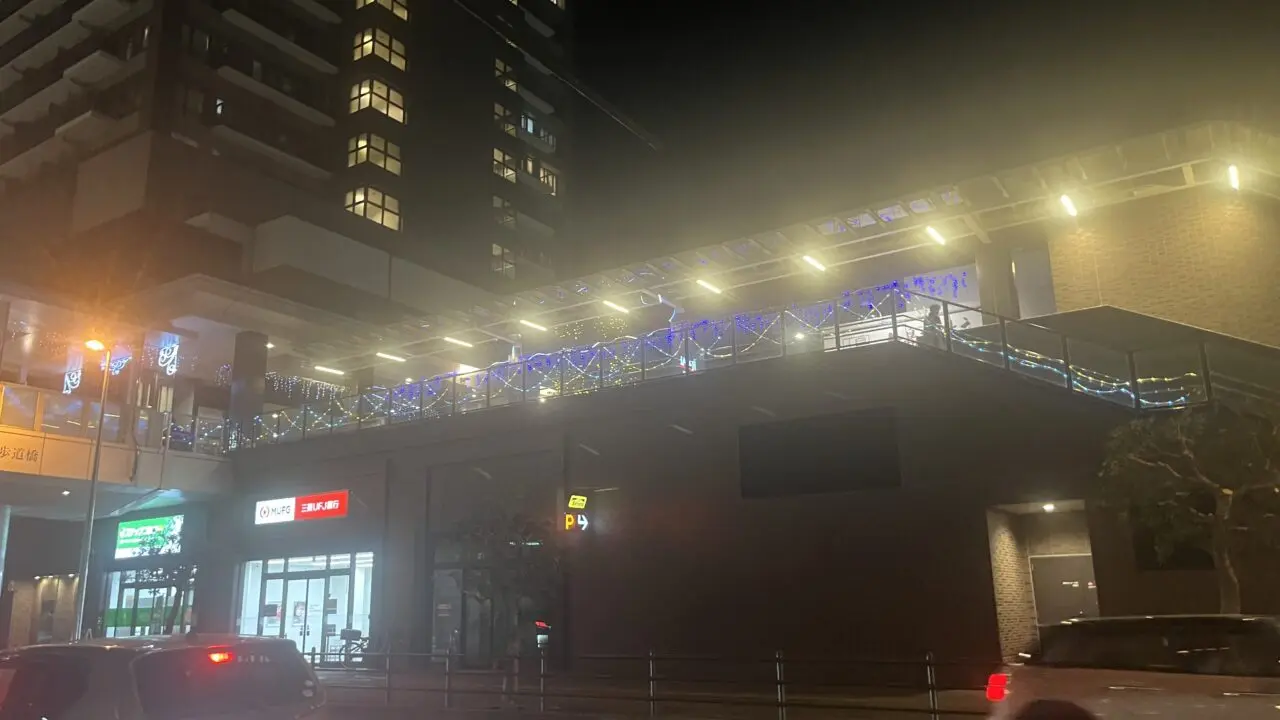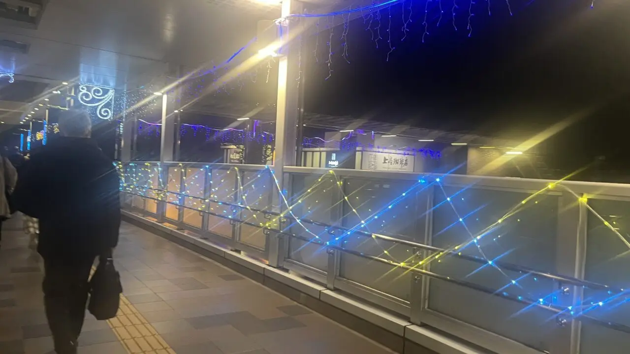駅の外、バスロータリー側からも通路沿いのイルミネーションがよく見えました。小田急相模原の駅は、改札から直結した商業施設もあり、人通りの多いエリアです。交通機関を利用する方や買い物をされる方の目を楽しませてくれる光景ですね。