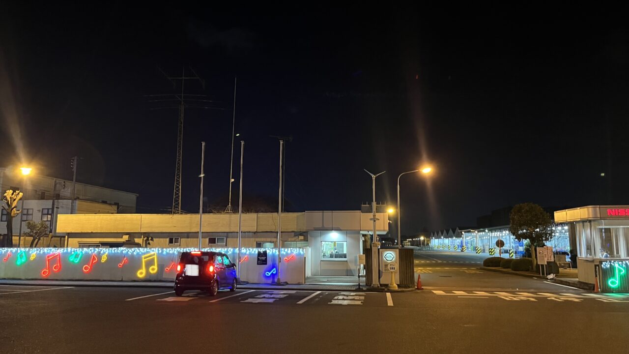 県道52号線、相模大野から北里大学方面へ向かう途中、麻溝台にある「日産相模原部品センター」で夜間のイルミネーション点灯を見つけました。(撮影時2025年12月17日)駅前や商業施設でのイルミネーションは南区内でもよく見かけましたが、「日産相模原部品センター」というところが意外でした! このエリアは車通りも多く、時間帯によっては渋滞が起きやすい区間でもあるので、バスや車で走行中に停車するタイミングが多い場所かと思います。夜間は街灯が少ないこともあり、暗さや人通りの少なさで不安になることもありますが、こうしてきらびやかなイルミネーションが目に入ると、ほっこりしますね。イルミネーションが設置されているのは「日産相模原部品センター」従業員通用門のある辺りです。植栽にはブルーの電球、塀にはカラフルな音符マークが並んでいます。県道52号線を走行中に見つけたイルミネーションの景色でした。街を歩く人の目を楽しませてくれる試みですね。