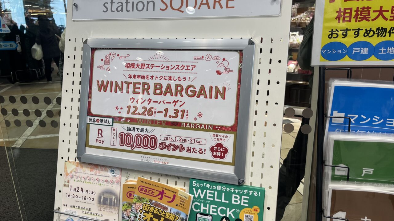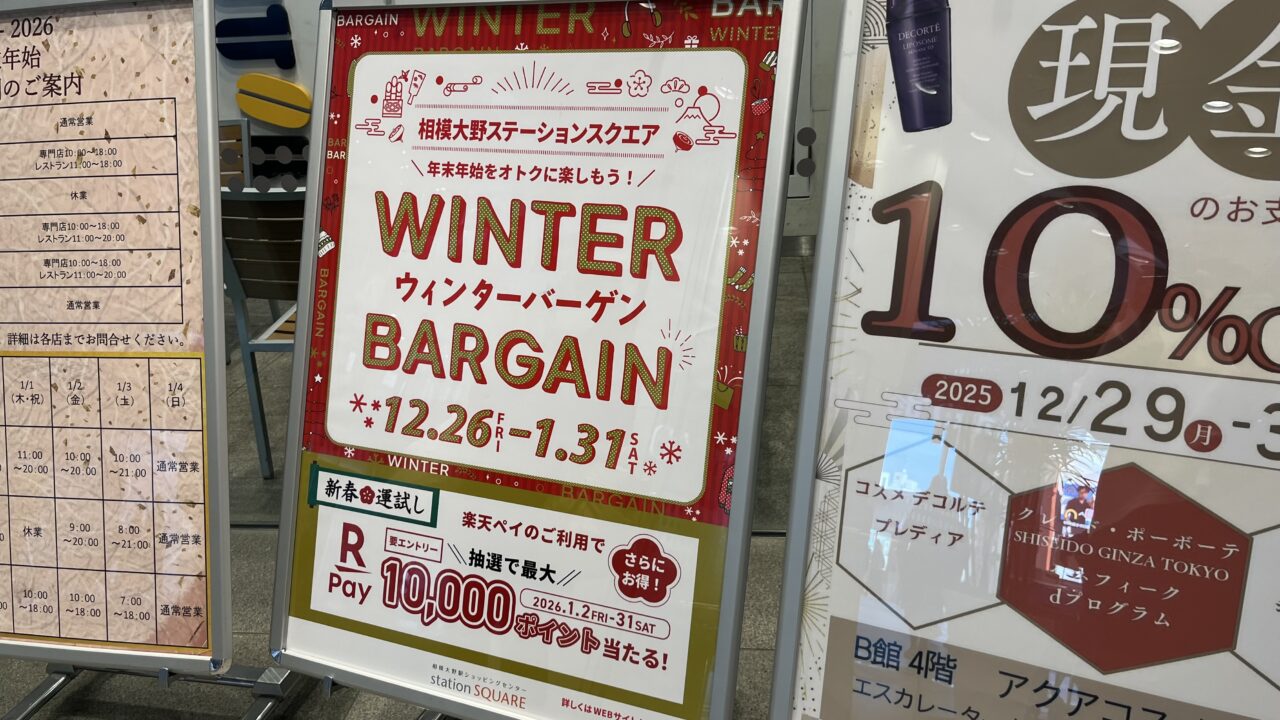 小田急線相模大野駅直結の「相模大野ステーションスクエア」でウインターバーゲンが開催中です。期間は2025年12月26日~2026年1月31日まで、一か月以上も開催しているバーゲン期間中はお買い得品が見逃せませんね。