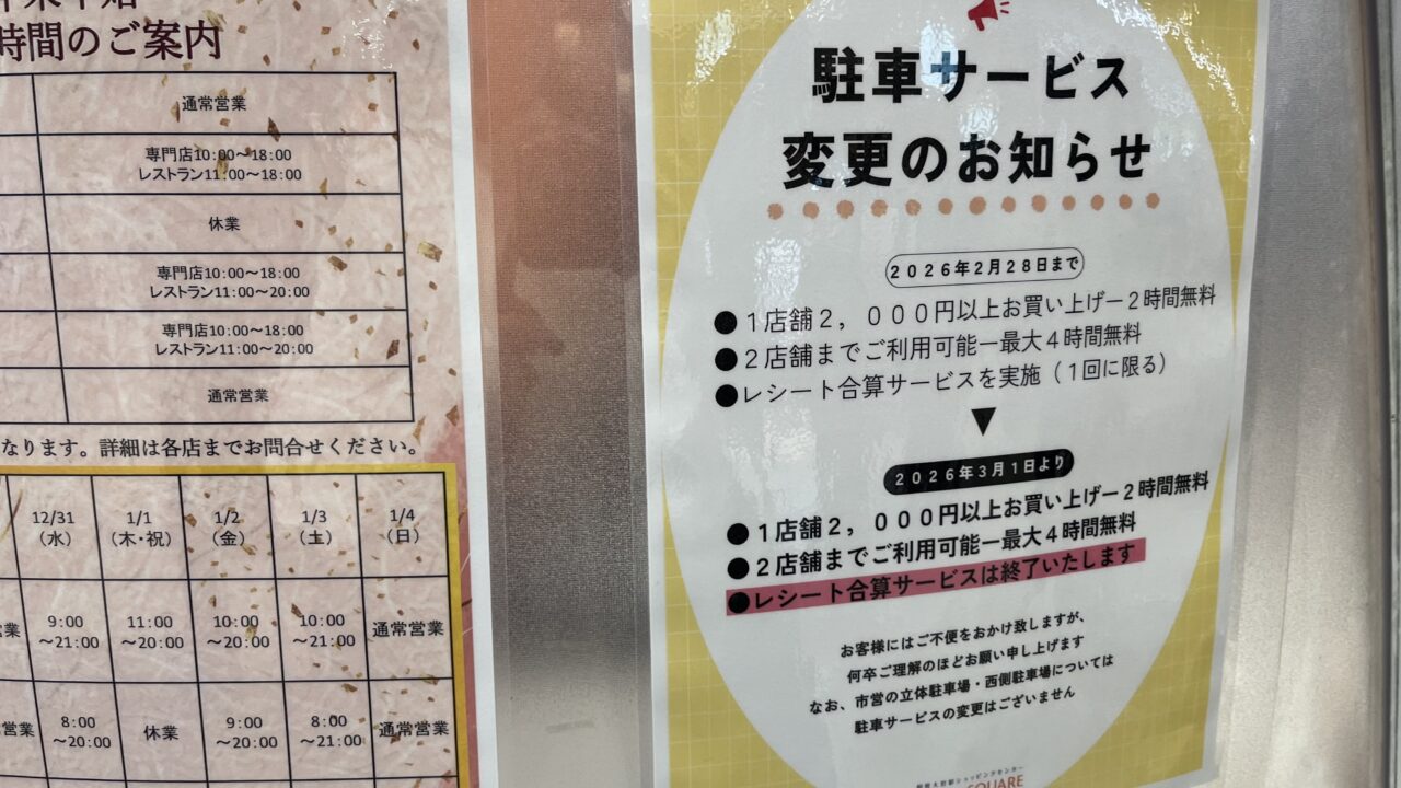 残念ながらレシート合算サービスは終了するようです。普段、ステーションスクエアの駐車場を利用されている方は3月からのサービス変更にご注意ください。