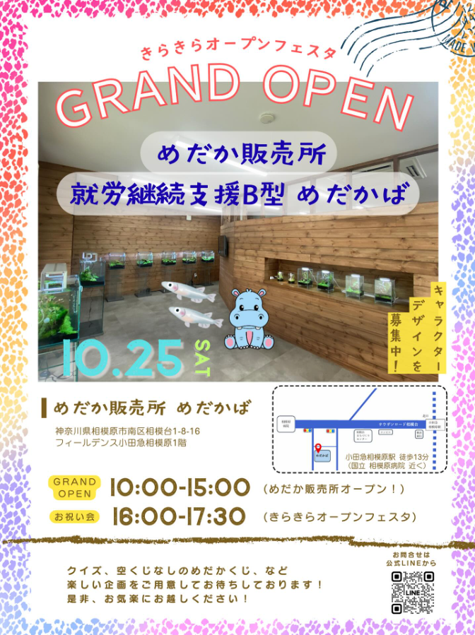 2025年10月25日、相模台に就労継続支援B型事業所「めだかば」 がオープンしました。こちらは株式会社クレオが運営する福祉事業所・めだか販売所で、めだかの飼育、繁殖に関わる仕事を通して、情緒安定、体調管理の大切さを体験できる場所です。