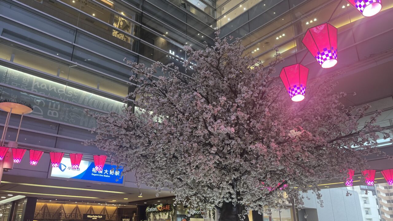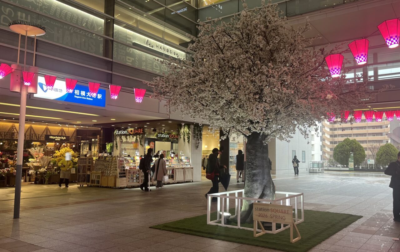 相模大野駅前でひと足早い春を楽しめる恒例の桜装飾が、今年も登場しています。会場は、駅直結の商業施設相模大野ステーションスクエア3階アトリウム広場。期間は2026年2月28日(土)から4月12日(日)までです。 吹き抜け空間に設置されたのは、高さ約5メートル、枝張り約3.6メートルの迫力ある桜の木。買い物や通勤・通学の途中に立ち寄るだけで、春の訪れを感じられる駅前のお花見スポットとして親しまれています。天候に左右されず楽しめるのも、屋内ならではの魅力です。今年の大きな見どころは、夕方から始まる「夜桜」演出。桜を囲むように設置された桜模様のぼんぼりが温かな光を灯し、昼間とは異なる幻想的な雰囲気を演出します。仕事帰りやディナーの後に、ご家族や友人とゆったりと夜桜見物を楽しむのもおすすめです。さらに、桜の木の下にはフォトスポットも用意。春らしい写真を撮影し、SNSに投稿するなど思い出づくりも楽しめます。昼と夜で表情を変える駅前の桜。気軽に立ち寄れるお花見スポットとして、今年も多くの人でにぎわいそうです。