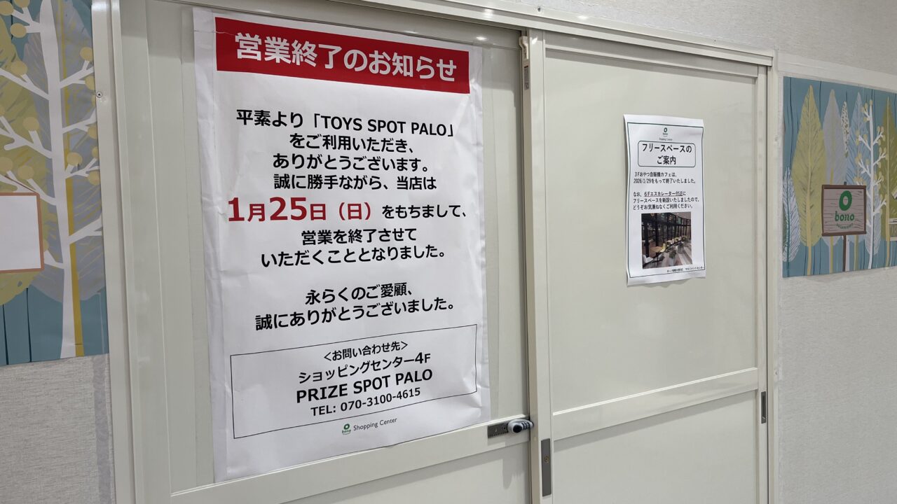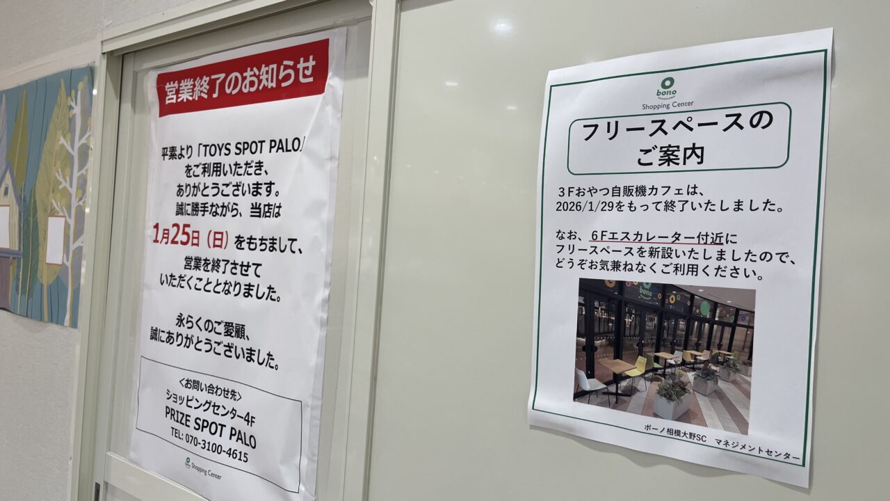 こちらのスペースは2025年2月7日にオープンしましたが、残念ながら約一年での営業終了となりました。「おやつ自販機カフェ」は、8台ほどのバリエーション豊かな自販機が並ぶ休憩スペースで、手軽に購入でき、買ったおやつがその場で食べられる点が特徴でした。テーブルをはさんだ隣には、1月25日に閉店した「TOYS SPOT PALO」が営業していました。2つのテナントが同時期にクローズとなったようです。張り紙には、おやつ自販機カフェの閉店を告げる文章とともに、6Fエレベーター付近に新設されたフリースペースへの案内が記されていました。こちらも気兼ねなく利用できるようです。空いたテナントにはどんな店舗が新設されるのか、気になるところですね。