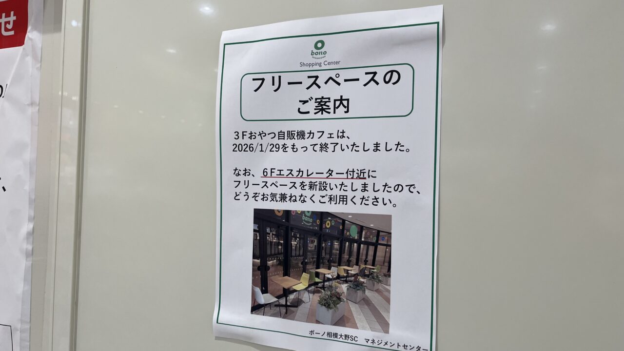 ボーノ相模大野3階の「おやつ自販機カフェ」が閉店していたようです。店舗があった場所には閉店を知らせる張り紙が設置されていました。