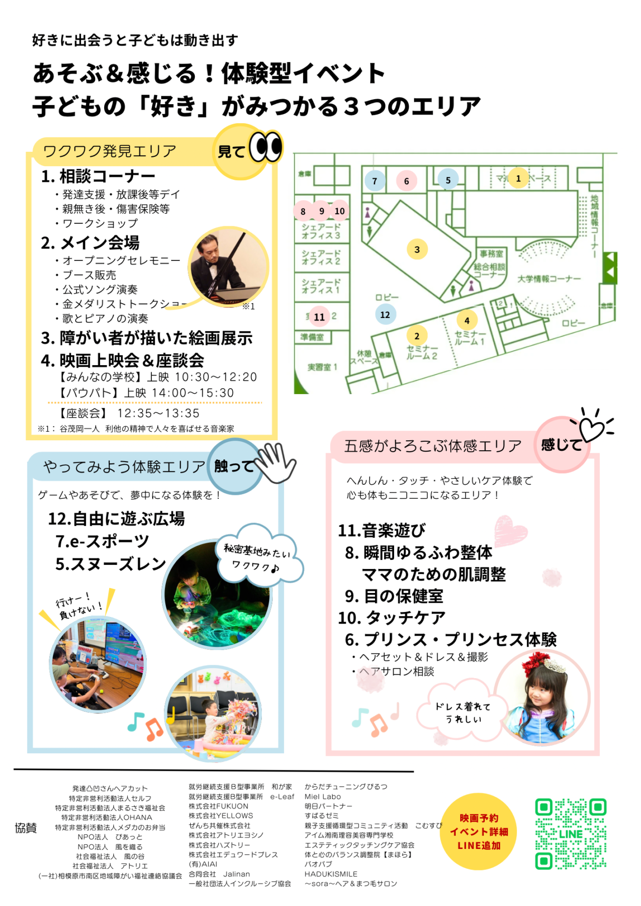 会場では、発達支援や放課後等デイサービスに関する相談・ワークショップをはじめ、音楽ライブやストリートピアノ、パラリンピック金メダリストによるトークショーなどのステージイベントを実施。さらに、光や音でリラックスできるスヌーズレンやeスポーツ体験、自由に遊べる広場など、子どもたちが自分のペースで楽しめる体験コーナーも充実しています。