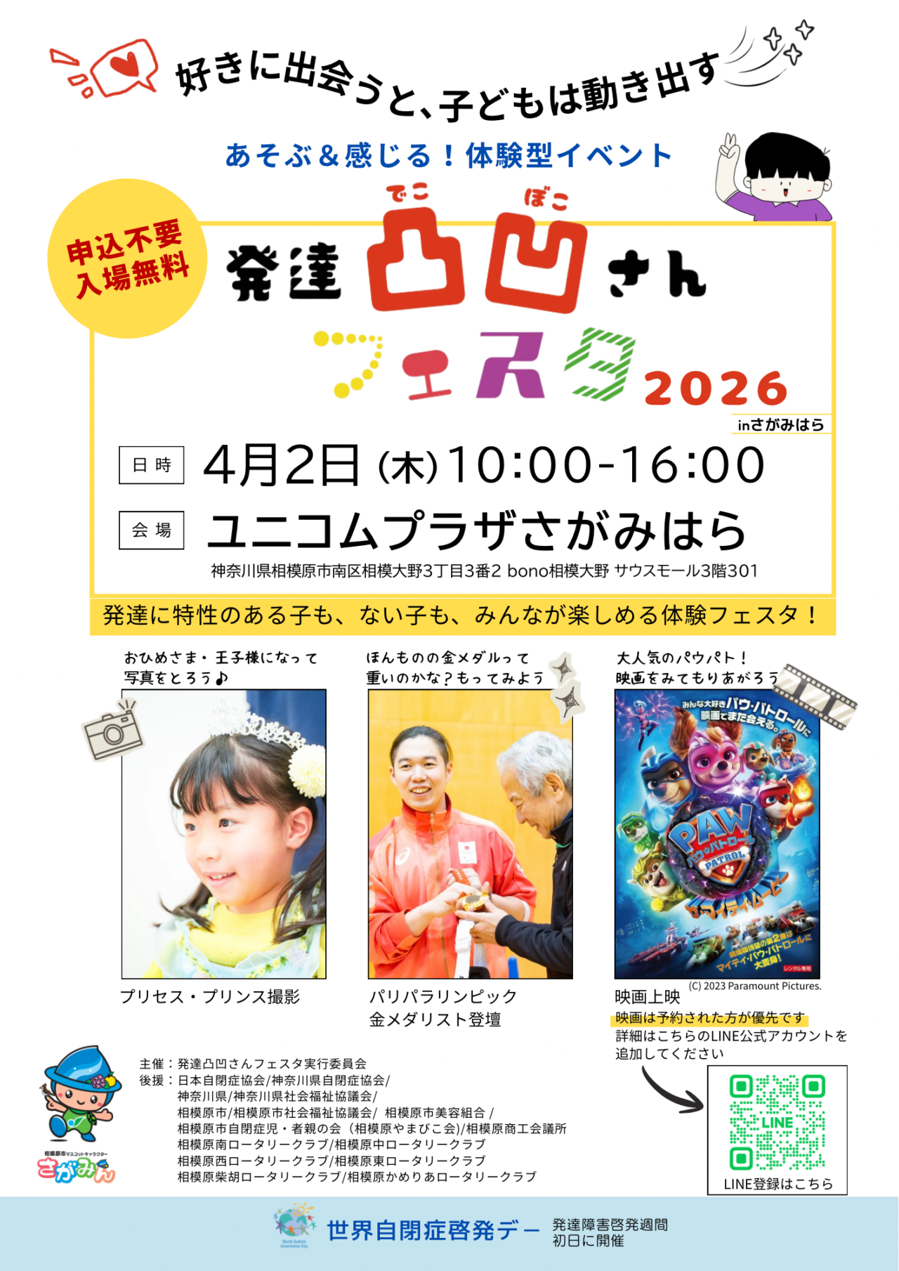 子どもたちの「好き」を見つける体験型イベント「発達凸凹さんフェスタ2026」が、2026年4月2日(木)にボーノ相模大野内ユニコムプラザさがみはらで開催されます。