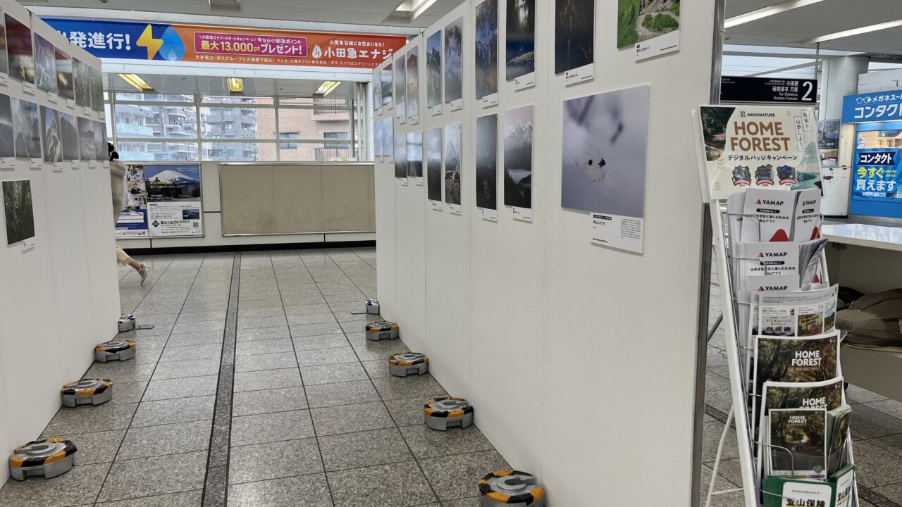 こちらでは、小田急電鉄の協力のもと、登山やハイキング、トレイルランニングといったアウトドア活動に特化したプラットフォーム「YAMAP(ヤマップ)」が主催する「YAMAPフォトコンテスト 2025」の受賞作品を展示しています。その名も「山歩(さんぽ)しよう。展」。珠玉の50作品を小田急線・相模大野駅のコンコースにて展示中です。