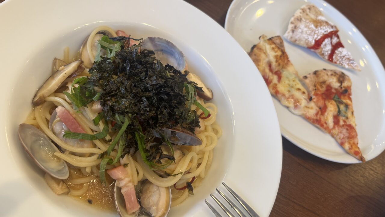 メインメニューに加え、ピッツァの食べ放題セットも健在。ここでは店員さんが各席を回ってカットした焼きたてピザを配ってくれるスタイルが特徴です。